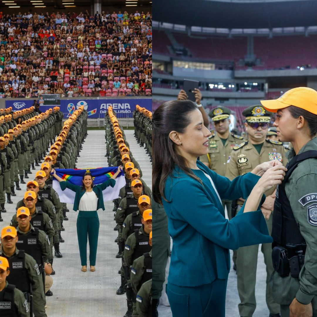 Pernambuco viveu um dia histórico, nesta terça-feira (12), quando passou a contar com 2.299 novos policiais militares após anos sem um aumento expressivo no efetivo. Dentro das ações do programa Juntos pela Segurança, a governadora Raquel Lyra comandou, diante de familiares e autoridades, a solenidade de formatura, na Arena de Pernambuco, da turma batizada de Bicentenário da Polícia Militar de Pernambuco, composta por 1.979 homens e 320 mulheres, que passam a integrar o Quadro Policial Militar Geral (QPMG) da corporação. Nesta terça, os novos soldados foram nomeados no Diário Oficial do Estado e, a partir da próxima segunda-feira (18), estarão nas ruas servindo à população pernambucana, representando o maior ingresso da instituição em anos. A vice-governadora Priscila Krause também participou do evento.