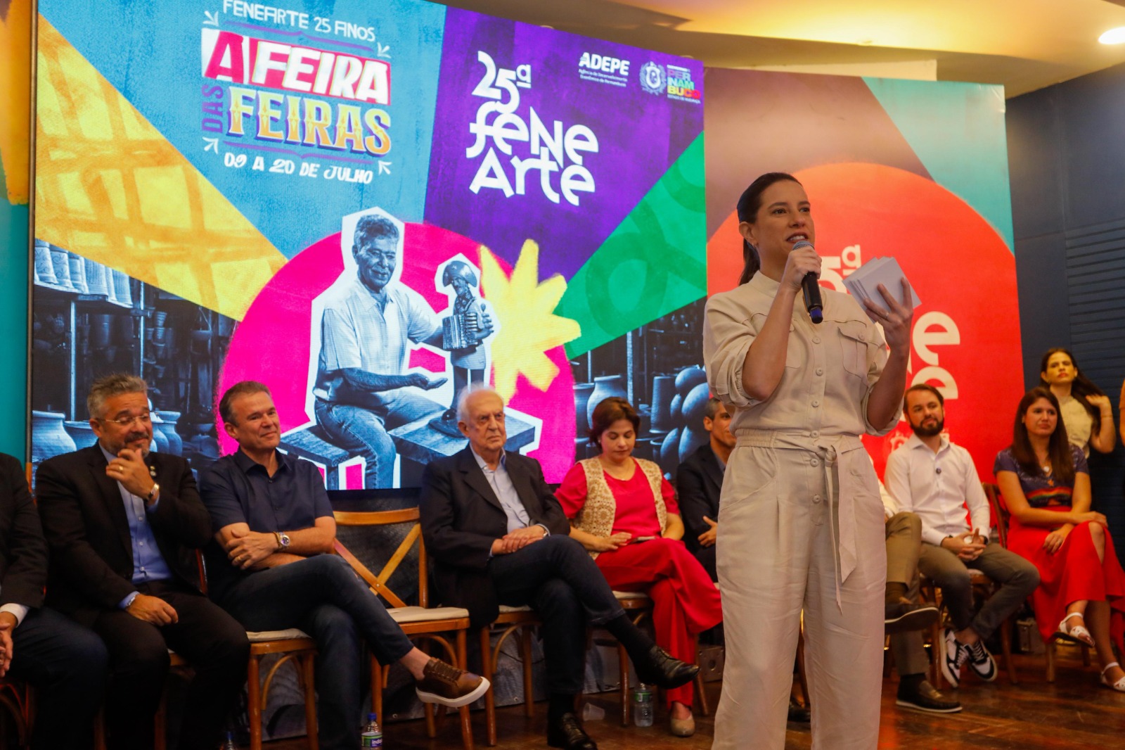 A governadora Raquel Lyra realizou, nesta sexta-feira (20), o lançamento oficial da 25ª edição da Feira Nacional de Negócios do Artesanato (Fenearte), considerada a maior feira de artesanato da América Latina. Com o tema “A Feira das Feiras”, a edição deste ano será realizada de 9 a 20 de julho, no Centro de Convenções de Pernambuco, em Olinda, e celebrará duas décadas e meia de valorização da cultura popular e dos saberes artesanais do Brasil. Para esta edição, o Governo de Pernambuco está investindo R$ 15 milhões, por meio da Agência de Desenvolvimento Econômico de Pernambuco (Adepe). Durante a solenidade, foi prestada uma homenagem especial às pessoas que contribuíram diretamente para a realização da primeira edição da Fenearte. Entre os homenageados, estavam o ex-governador e criador da feira, Jarbas Vasconcelos.