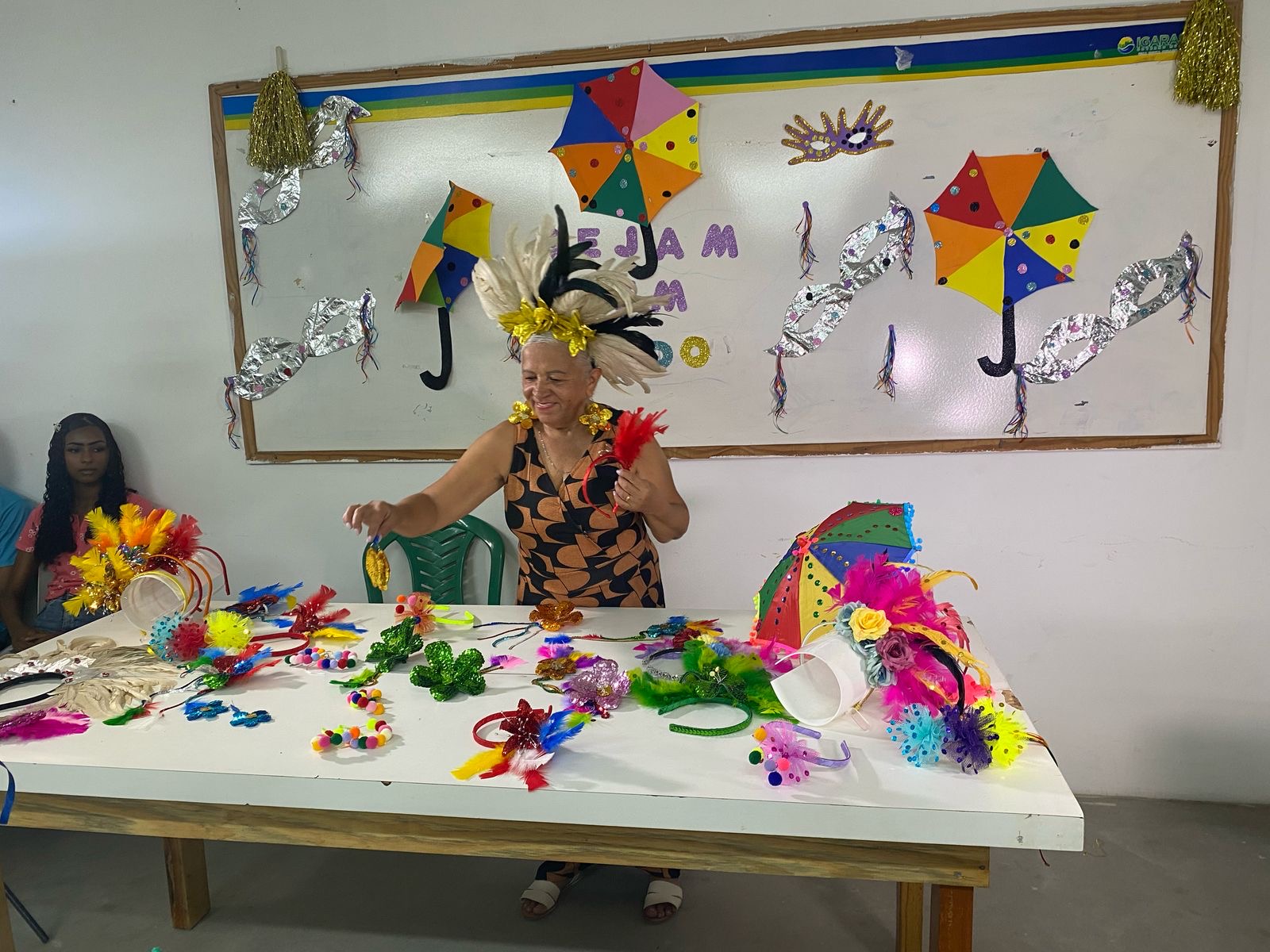 Entre os cursos oferecidos, o destaque é a Oficina de Customização de Adereços, que incentiva a criatividade na produção artesanal de ornamentos carnavalescos e impulsiona o negócio das empreendedoras durante os festejos.