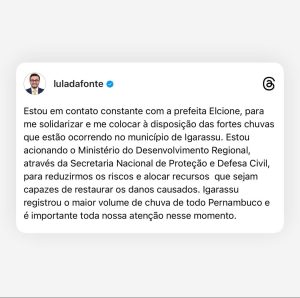 O deputado federal Lula da Fonte foi mais uma liderança que se posicionou. Ele publicou uma nota nas redes sociais demonstrando preocupação com os impactos da chuva e reforçando seu compromisso com Igarassu. Lula afirmou que está à disposição para somar com a prefeitura e buscar alternativas junto ao Governo Federal para apoiar o município.
