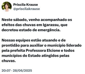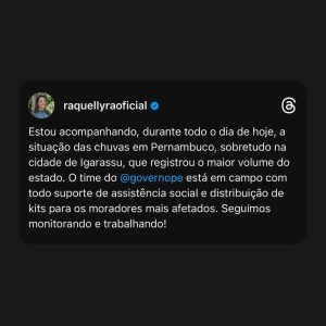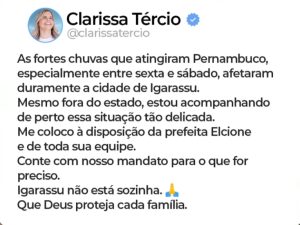 A deputada federal Clarissa Tércio, mesmo fora do estado, fez questão de se manifestar. Em publicação, disse estar acompanhando os desdobramentos da situação de longe e se colocou à disposição da prefeita Elcione para contribuir com ações que tragam alívio e soluções para os igarassuenses atingidos.